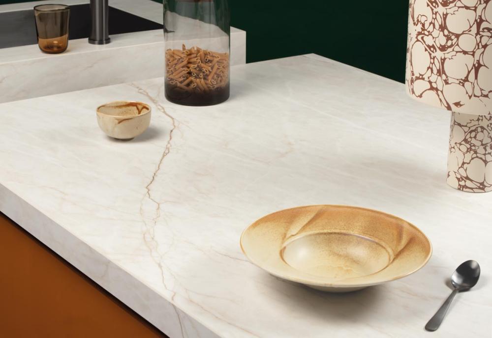 Taj Mahal bietet eine elegante Steinoptik mit einer warmen sandfarbenen Basis, feiner Maserung und einem raffinierten Design, das an klassischen Marmor erinnert. Diese stilvolle Ausstrahlung ist jetzt auch in modernen Materialien und Farbvarianten erhältlich, wie Evora Ceramics Frosted Mahal (helles Weiß) und Taj Regal (kühles Grau). Doch das ist noch nicht alles: Auch in der hochwertigen Evora Qstone-Kollektion glänzt Taj Mahal in der Farbe Covello. Diese steinähnlichen Materialien passen perfekt zu verschiedensten Küchenstilen – von ländlich bis minimalistisch.
